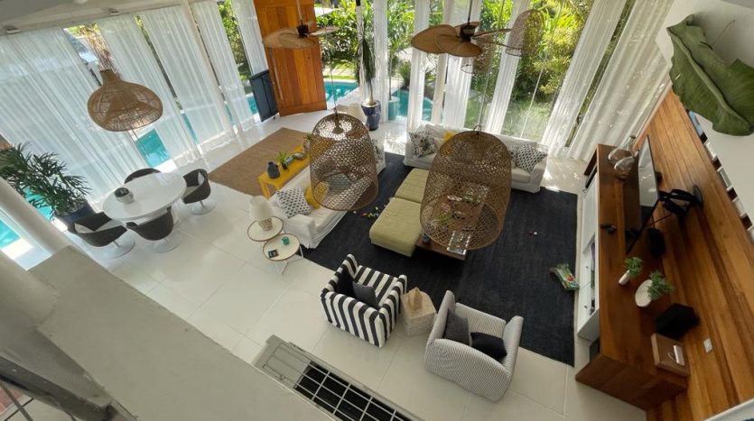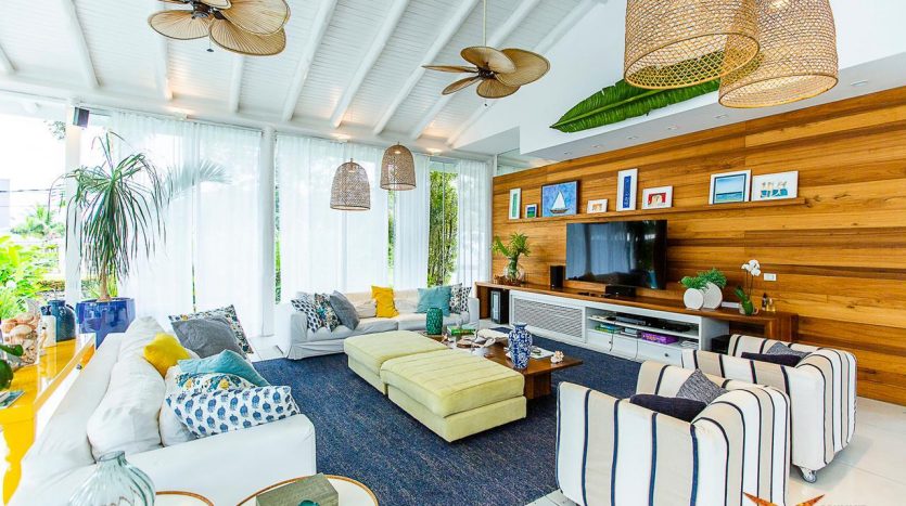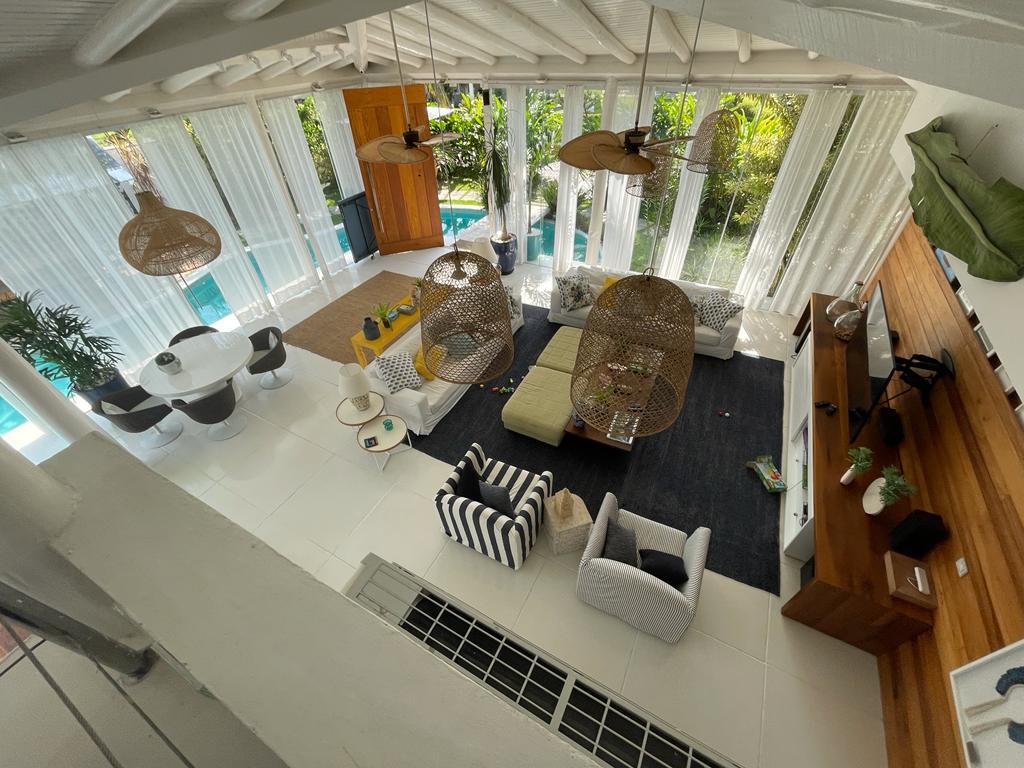 • Ampla sala com pé direito alto dividida em ambientes de TV, jantar e estar