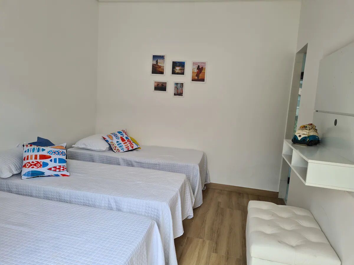 - 06 suítes (01 cama de queen; 01 cama de casal + solt; 01 com três camas de casal; 01 com três camas de solt)