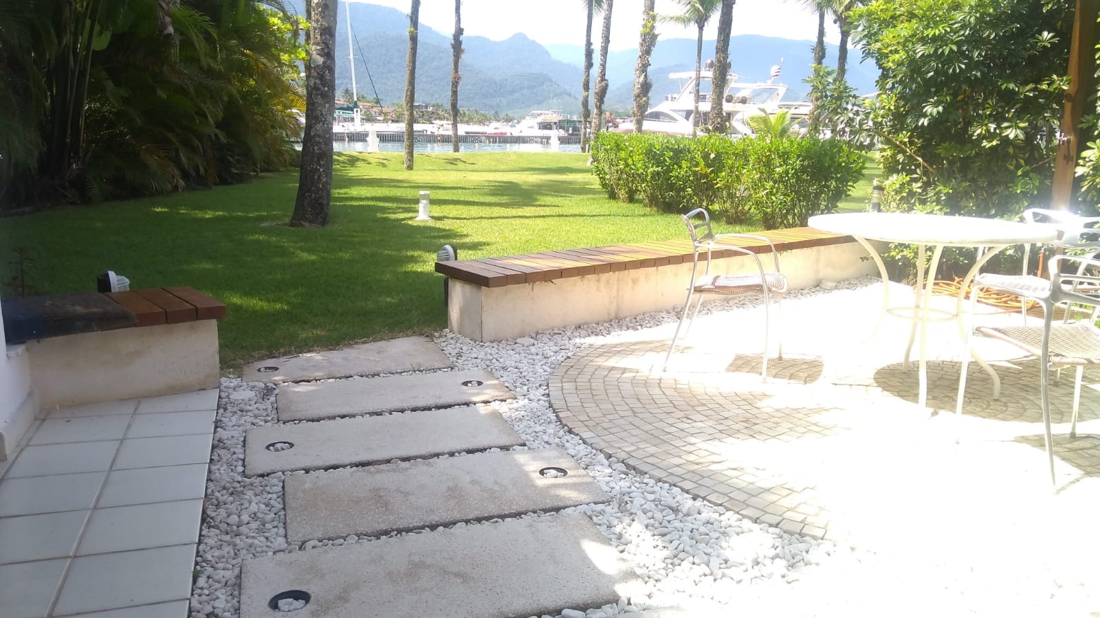A poucos passos da praia, lojas e restaurantes, imóvel diferenciado, germinado somente de um lado, jardim muito bem cuidado com linda vista do porto.